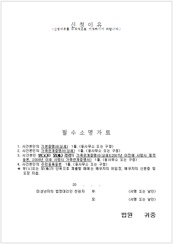 미성년자용 개명허가 신청서는 법정대리인(친권자)의 인적사항을 기록한다는 점이 성년자용과의 차이점입니다.