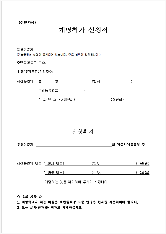 개명허가 신청서는 성년자용과 미성년자용으로 구분되니 유의하셔야 합니다.