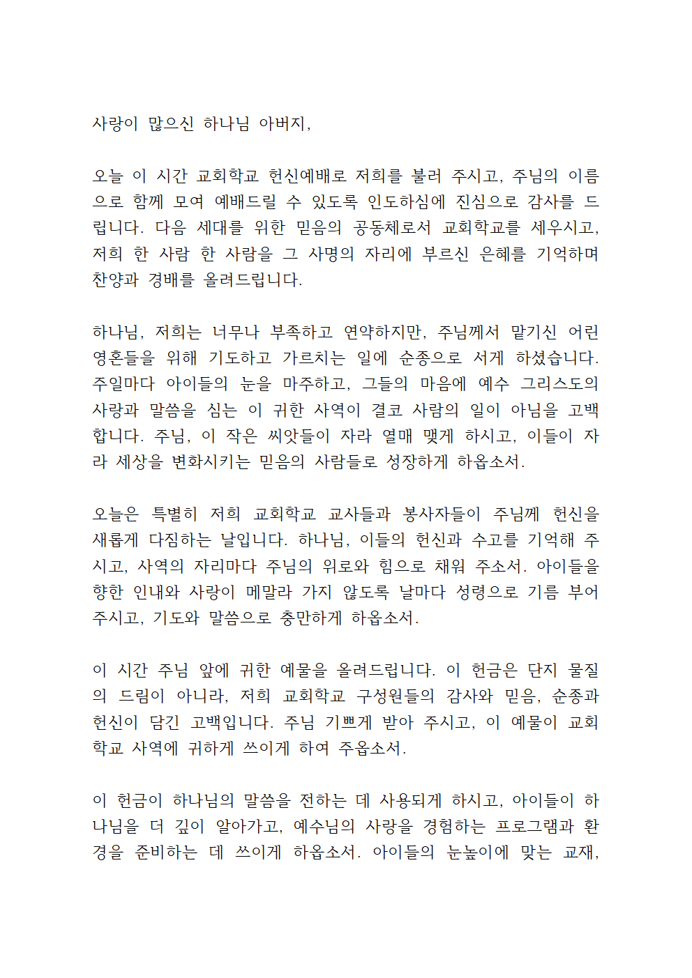 '교회학교 헌신예배 헌금 기도문'