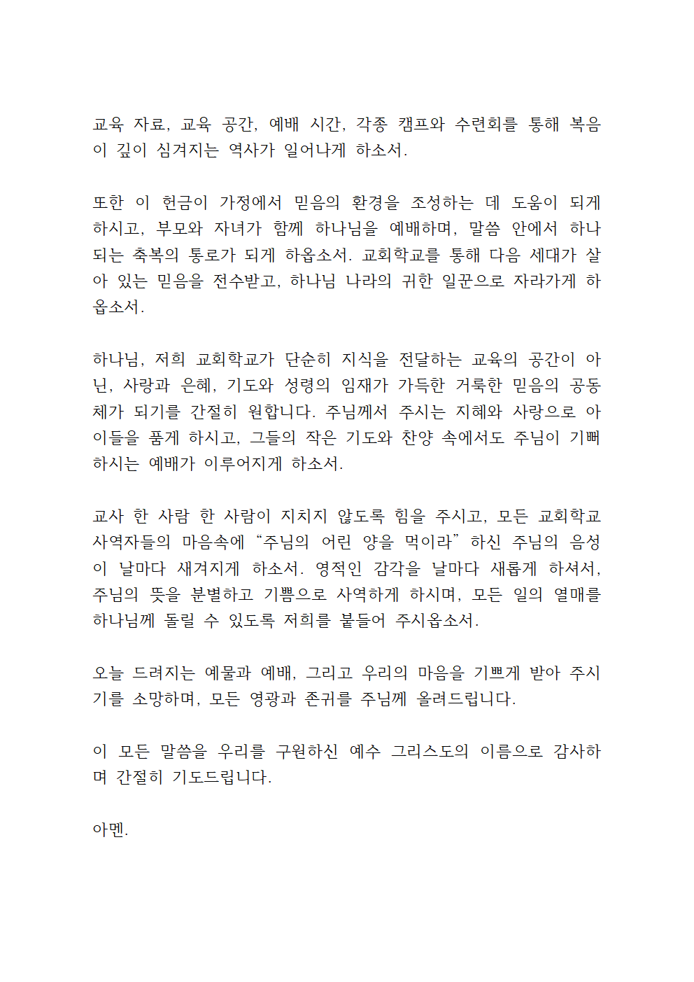 또한 이 헌금이 가정에서 믿음의 환경을 조성하는 데 도움이 되게 하시고, 부모와 자녀가 함께 하나님을 예배하며, 말씀 안에서 하나 되는 축복의 통로가 되게 하옵소서. 교회학교를 통해 다음 세대가 살아 있는 믿음을 전수받고, 하나님 나라의 귀한 일꾼으로 자라가게 하옵소서.