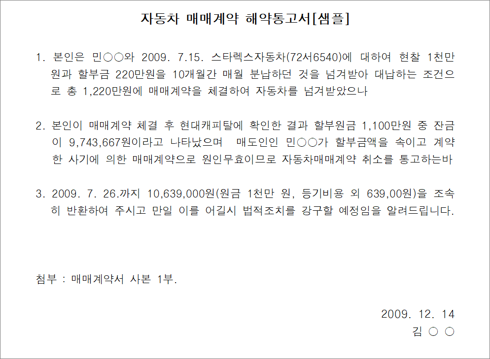 ※ 내용증명 양식(계약해제통보)을 살펴보시려면 다음을 참고하세요.