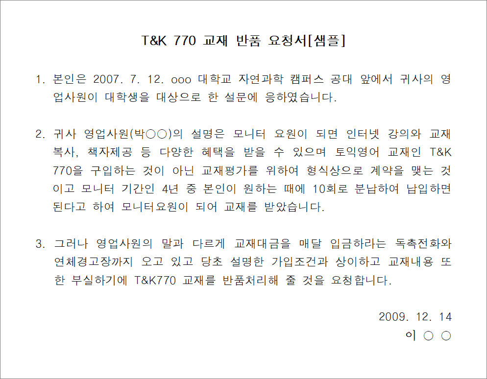 ※ 내용증명 양식(반품요청)을 살펴보시려면 다음을 참고하세요.