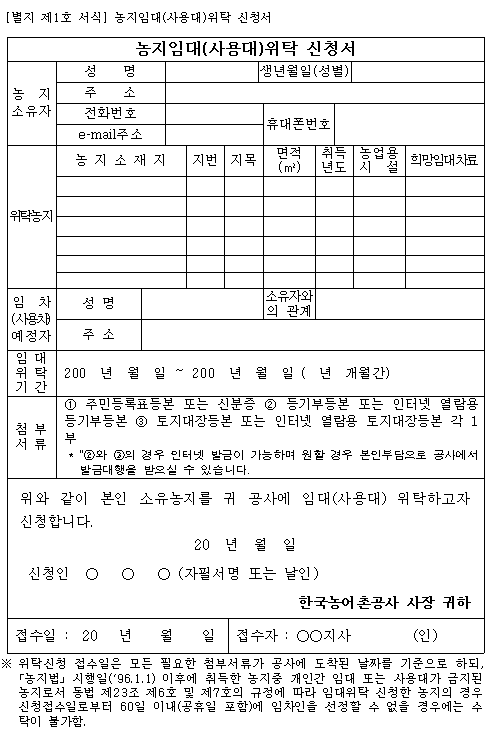 - 농지 소유자가 한국농어촌공사에 농지 임대를 의뢰.