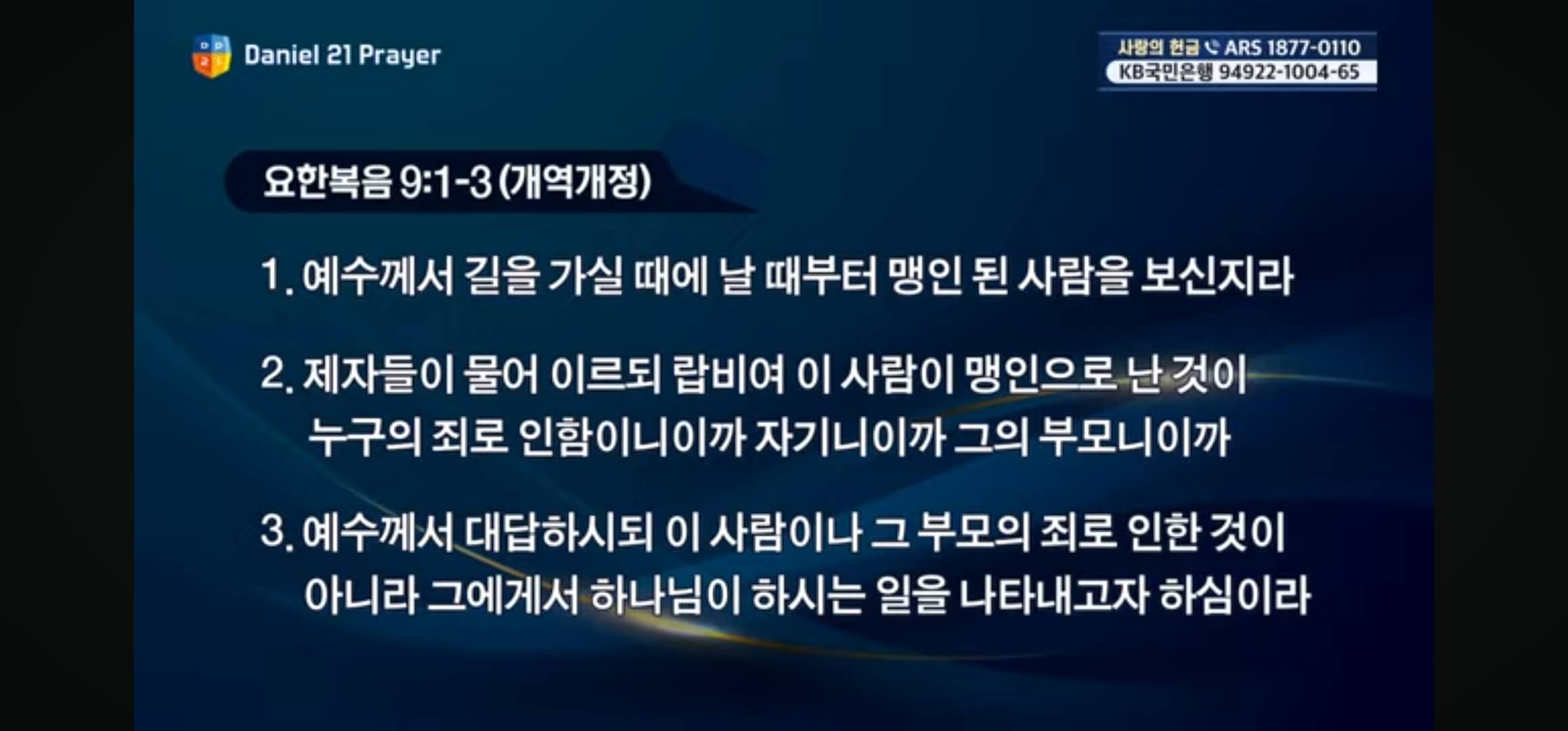1. 예수께서 길을 가실 때에 날 때부터 맹인 된 사람을 보신지라.
