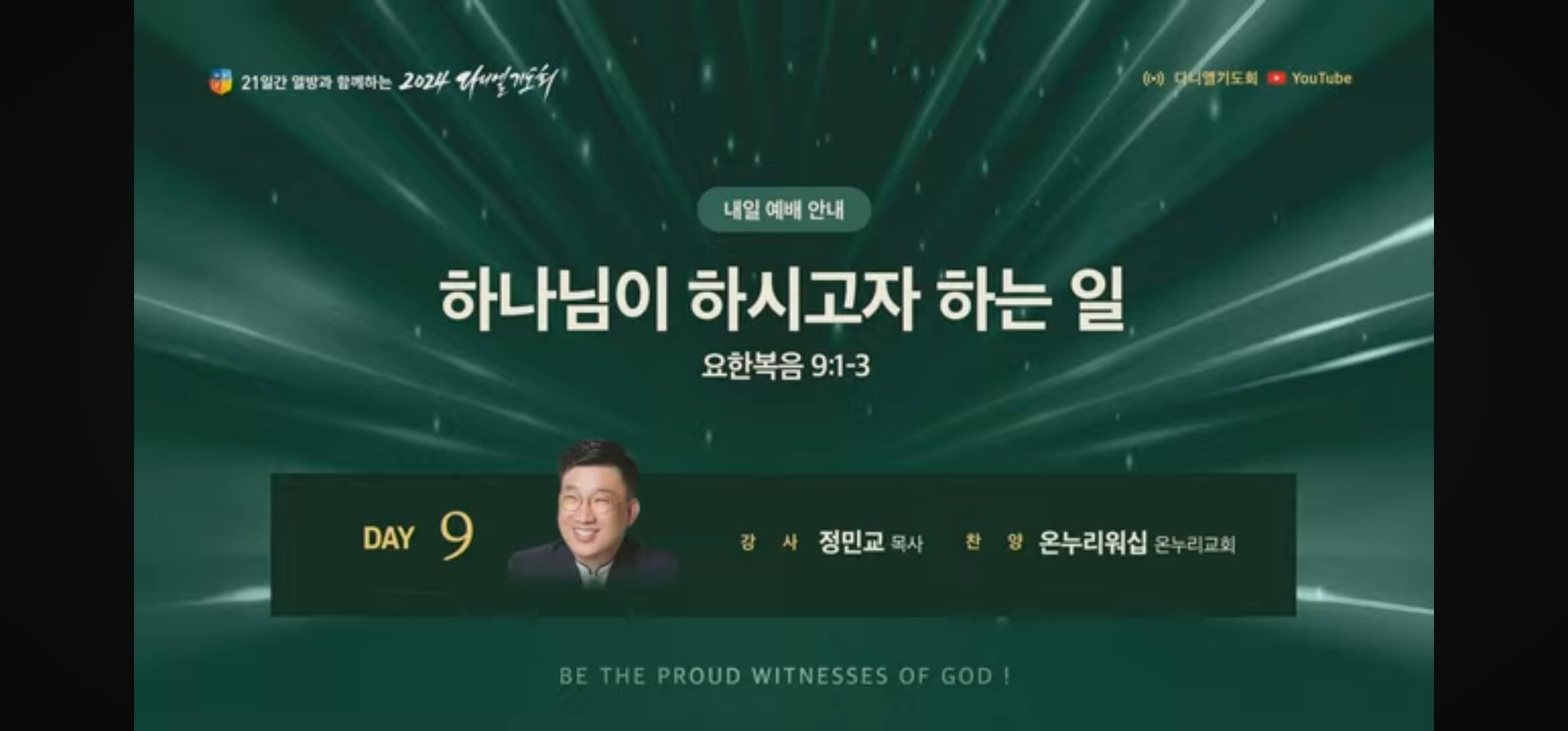 많은 도전과 비전을 갖게 하는 2024 다니엘 기도회 9일차 간증이었습니다.