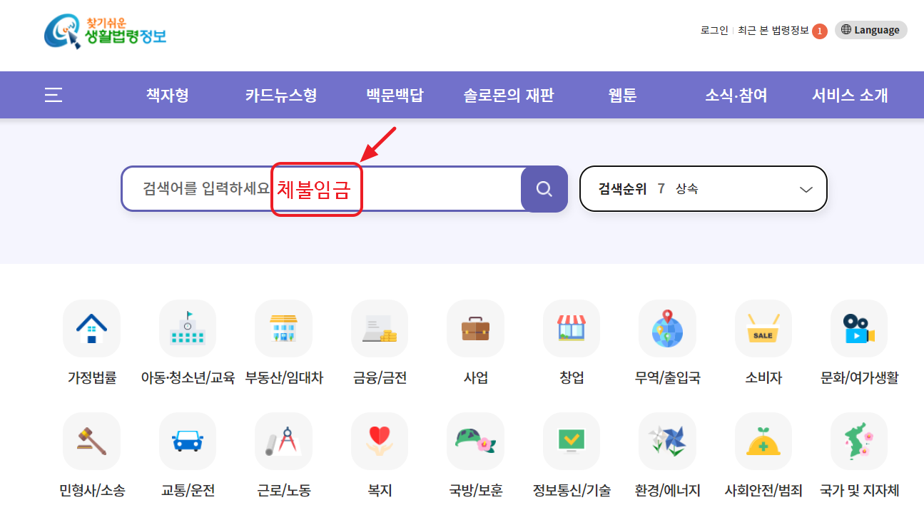 아래와 같이 '생활법령정보' 사이트에 접속하여 검색칸에 '체불임금'으로 입력하시면, 유용한 법령정보들을 찾을 수 있습니다.