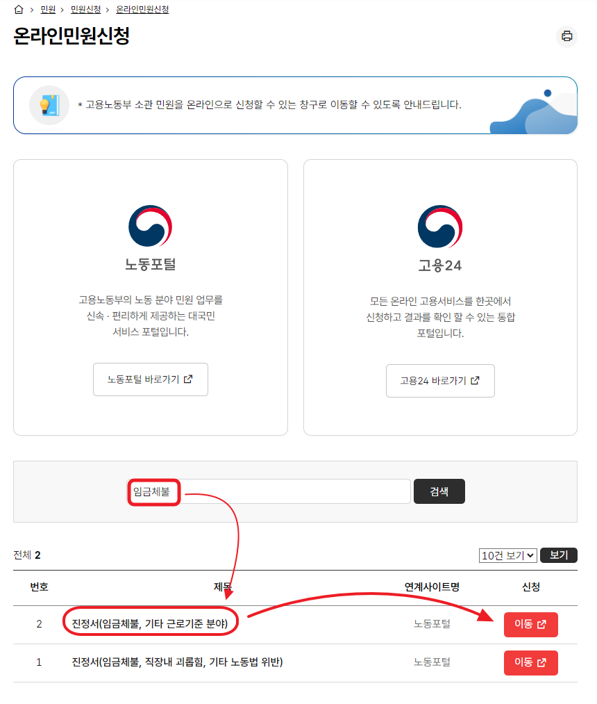 고용노동부 민원 > 민원신청 > 온라인민원신청 > 임금체불 진정서 신청을 통해 신고하는 방법입니다.