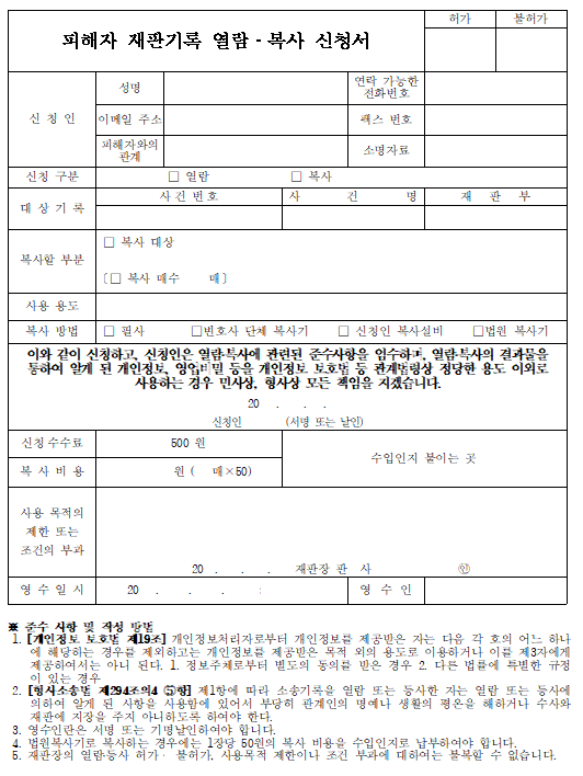 ※ 재판기록 열람복사 신청서 양식을 받으시려면 다음을 확인하세요.