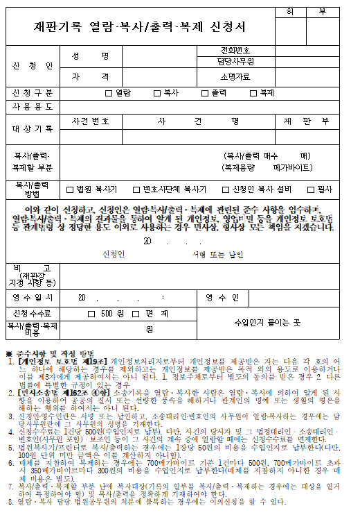 ※ 재판기록 열람복사 신청서 양식을 PDF 파일로 받으시려면 다음을 참고하세요.