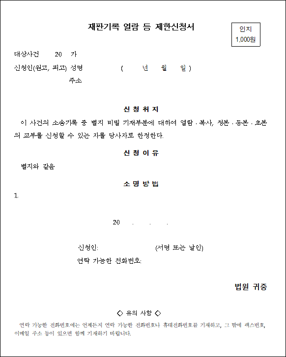 ※ 재판기록 열람 제한 신청서 양식을 살펴보시려면 다음을 참고하세요.