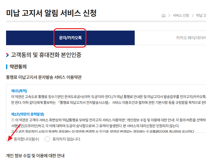 "문자/카카오톡" 서비스를 신청하면 다음과 같이 진행됩니다. 약관 동의 절차를 진행합니다.