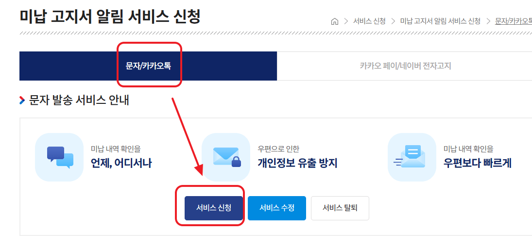 "문자/카카오톡" 또는 "카카오페이/네이버 전자고지" 서비스를 신청합니다.