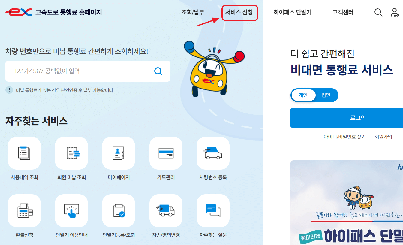 고속도로 통행료 홈페이지에 접속해서 "서비스 신청" 버튼을 선택합니다.