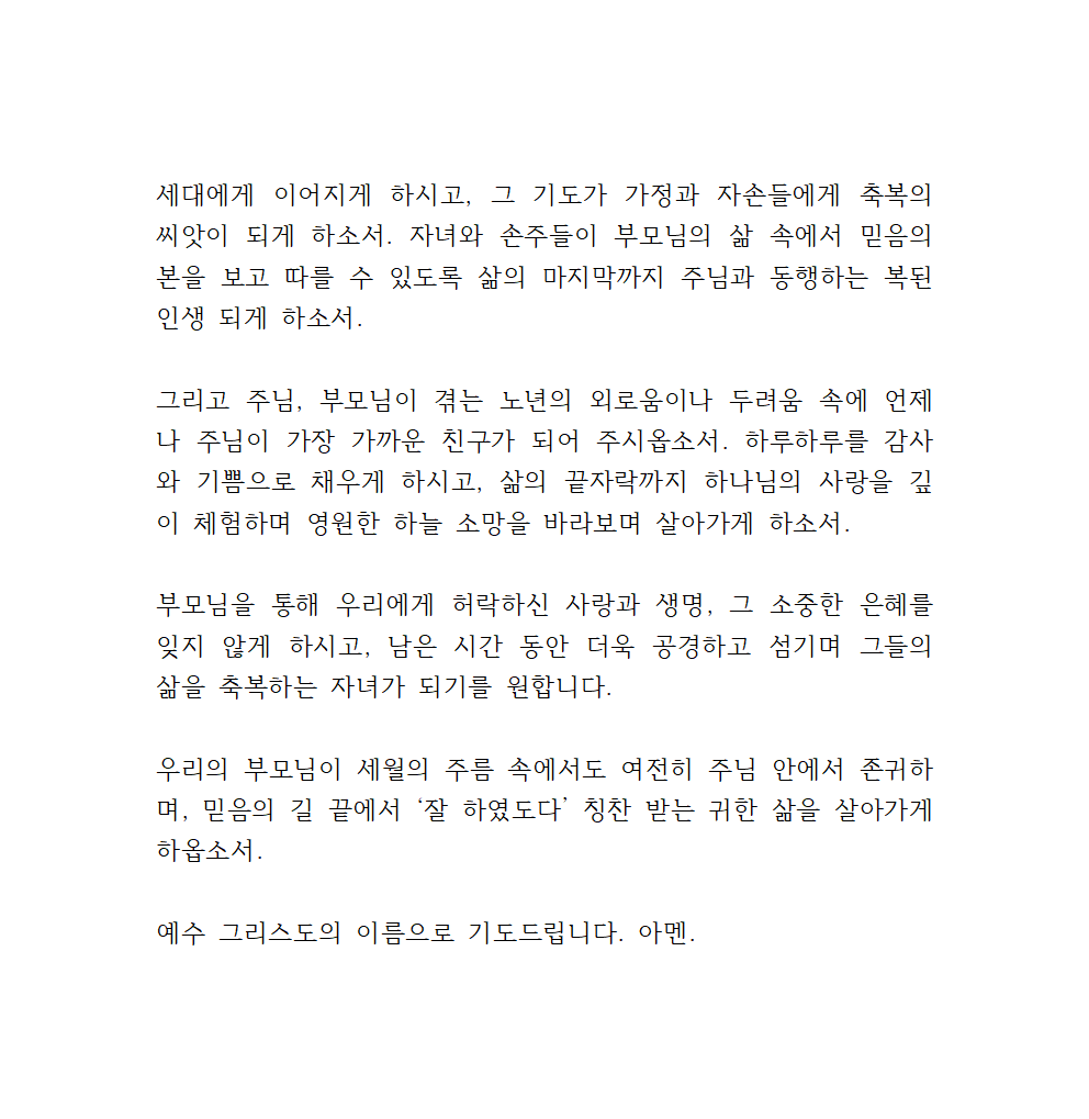 하나님, 부모님께서 지난 세월 쌓아온 신앙의 유산이 자녀와 손주 세대에게 이어지게 하시고, 그 기도가 가정과 자손들에게 축복의 씨앗이 되게 하소서. 자녀와 손주들이 부모님의 삶 속에서 믿음의 본을 보고 따를 수 있도록 삶의 마지막까지 주님과 동행하는 복된 인생 되게 하소서.