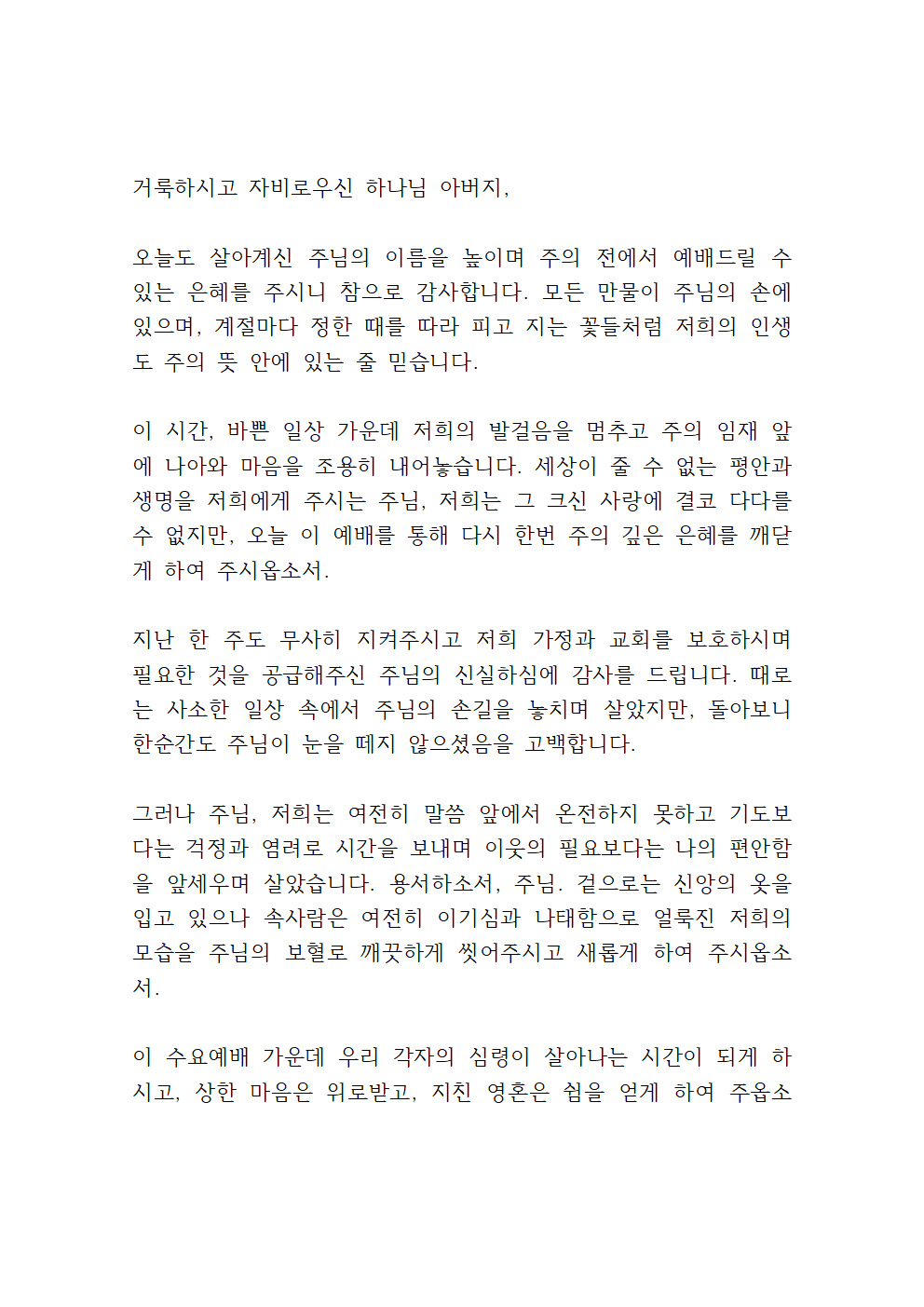 이 수요예배 가운데 우리 각자의 심령이 살아나는 시간이 되게 하시고, 상한 마음은 위로받고, 지친 영혼은 쉼을 얻게 하여 주옵소서. 주의 말씀에 순종하며 살아갈 힘을 얻게 하시고, 다시 세상을 향해 믿음의 걸음을 내딛는 담대함을 부어주시옵소서.