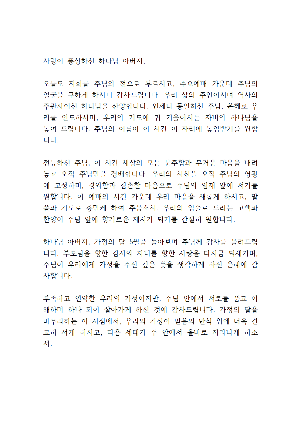 5월 넷째 주 수요예배 기도문 (두 번째 기도문)