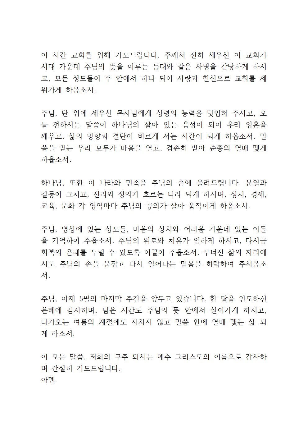 5월 넷째 주일낮예배 대표기도문 3