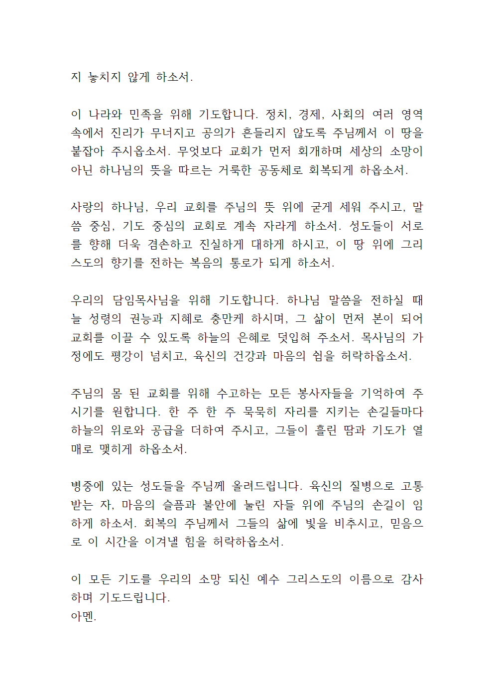 하나님, 오늘 우리가 드리는 이 예배가 삶의 전환점이 되게 하시고, 한 주의 시작이 아닌 한 생애를 드리는 진실한 예배가 되게 하소서. 말씀을 통해 깨어지고, 찬양 속에서 위로받으며, 기도 중에 소망을 얻게 하시고, 이 은혜를 세상으로 흘려보내는 복된 제자들 되게 하옵소서.