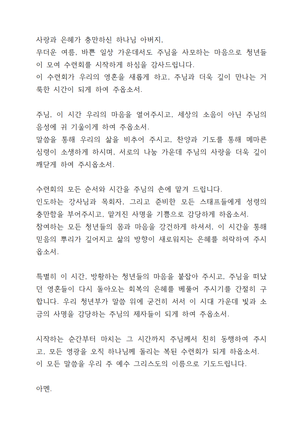 주님, 여름 사역이 진행되는 모든 공간을 주님의 보호로 덮어 주시고, 사고나 탈진 없이 건강과 안전을 지켜주소서. 아이들의 마음이 활짝 열리고, 찬양할 때 기쁨이 넘치며, 기도할 때 하늘 문이 열리고, 말씀을 들을 때 가슴이 뜨거워지는 놀라운 역사가 일어나게 하옵소서. 이들을 통해 교회가 새롭게 되고, 나라와 민족의 미래가 밝아지게 하옵소서.