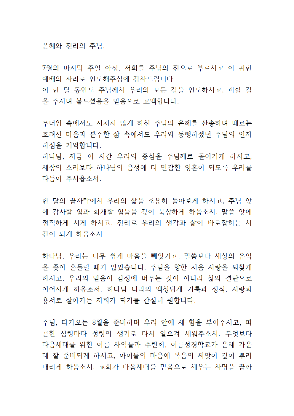 이번 글에서는 7월 넷째 주일 대표기도문을 안내해 드리겠습니다.