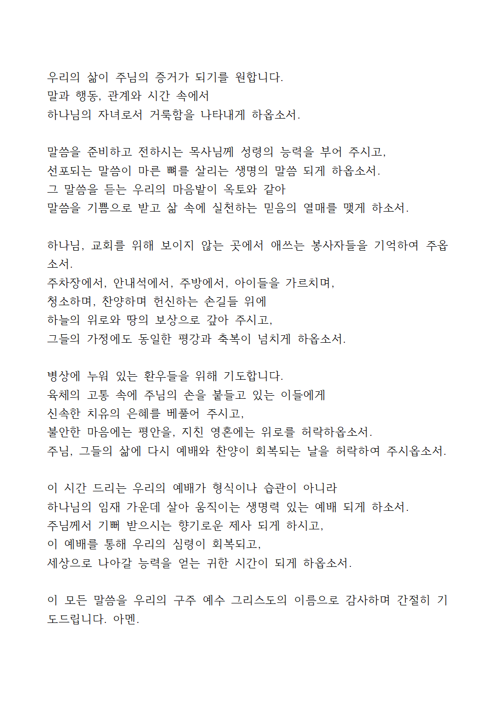 예배를 통해 우리 각자의 삶이 더욱 새로워지고 충만해지기를 간구합니다.